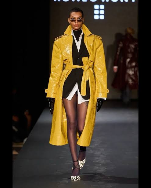 The collection reinforced his biggest strength: outerwear. Vogue’s Fall 2026 Romeo Hunte review highlighted standout pieces such as a double-breasted denim blazer with strong shoulders, croc-embossed trench coats in canary yellow and oxblood, and a dramatic leather cape. These looks captured Hunte’s signature balance of bold design and recognizable wardrobe forms.